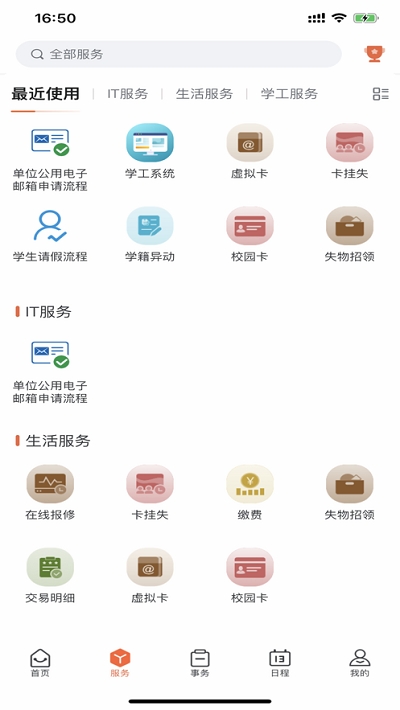 5. 在“事务办理”或“服务”页面,可以提交请假申请、财务报销等事务。