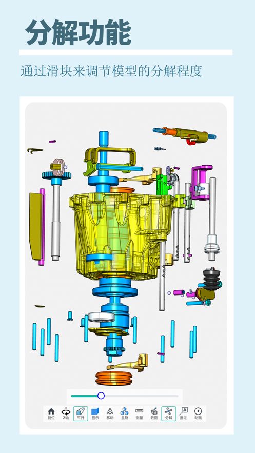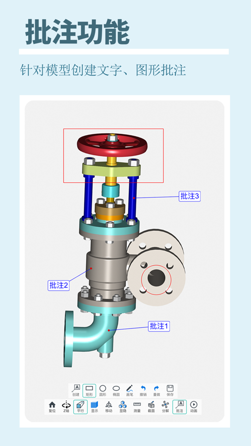 3. 丰富操作:支持模型旋转、缩放、移动等操作,以及截面分析、批注、爆炸图等高级功能。