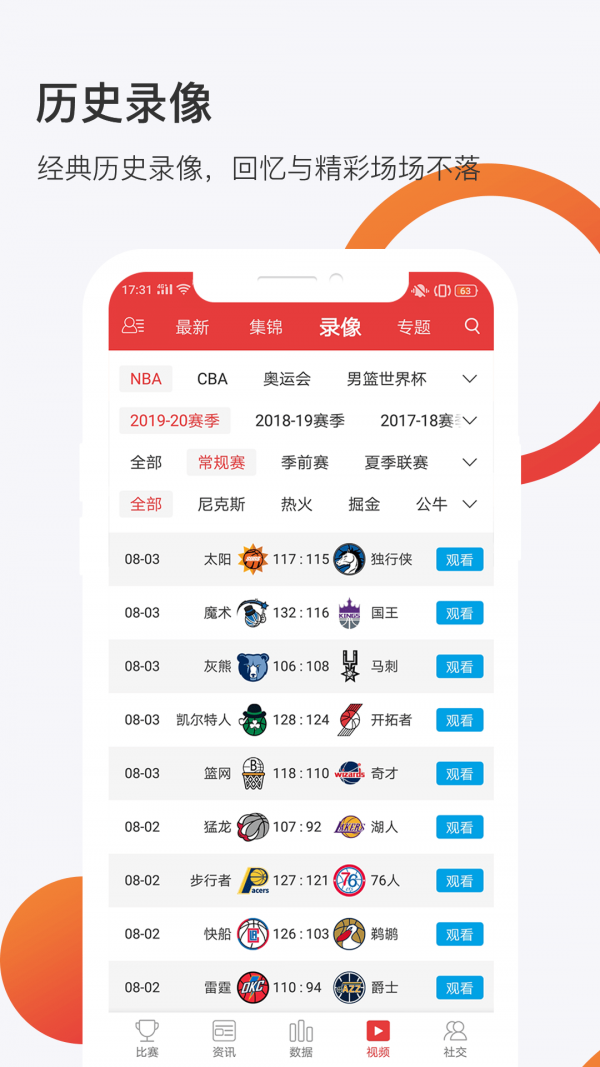 2. 进入比赛页面,观看nba、cba等赛事的直播和录播,参与比分竞猜游戏,观看视频精华等。