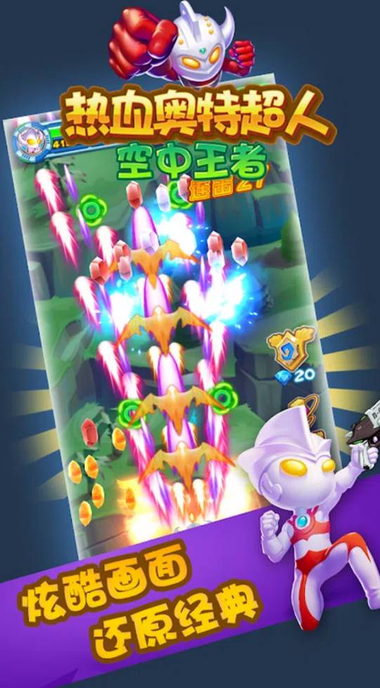 热血奥特超人空中王者是一款由奥特曼正版授权打造的动作飞行射击安卓手机游戏。游戏采用了q版动漫风格的画面,完美还原了经典奥特曼剧情、场景和人物,带给玩家一场视觉盛宴。在游戏中,玩家将扮演奥特曼,在空中与怪兽进行激烈的战斗,发射奥特光线射击,用奥特能量组成无敌弹幕,保卫地球的和平。游戏不仅有丰富的奥特曼英雄供玩家选择,还有精心设计的弹幕、酷炫的技能特效和有趣的道具效果,让玩家尽情享受战斗的乐趣。