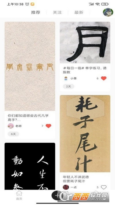 5. 分享与互动:点击页面中间的加号,发布自己的练习动态,并上传相应的照片,与其他书法爱好者交流互动。