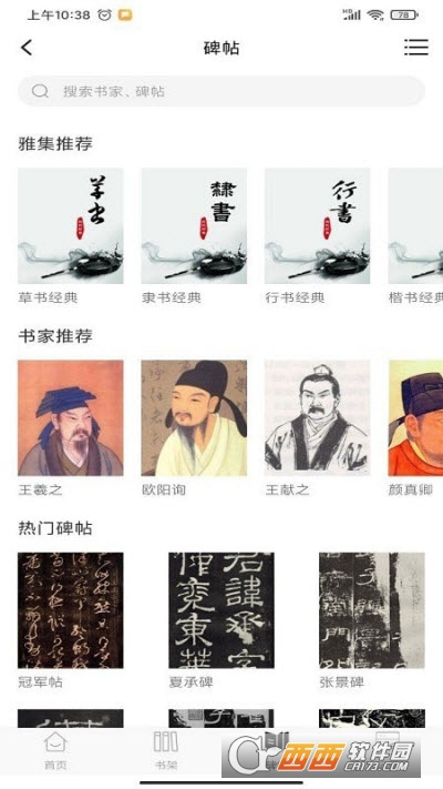 3. 碑帖查询:分类查看推荐的碑帖,一键加入书架,支持单字查询及临帖重影对比,帮助用户精准学习。