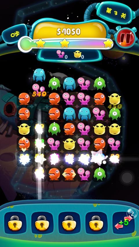 《星际消消乐》是一款大家都喜爱的益智休闲类三消游戏。游戏以星际探险为背景,搭配色彩丰富形象可爱的怪物元素,您一定能从中体验到消除游戏带来的不同寻常的乐趣。除了传统三消游戏模式以为,到指定关卡,还将开启全新模式——星际实验室。