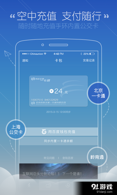 3. 公交出行便捷:内置市政交通一卡通功能,支持多城市公交、地铁刷卡支付,让出行更加便捷。
