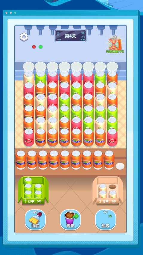 3. 道具辅助机制:提供“移除道具”(清理单个罐子)、“移走道具”(暂存无法匹配的罐子至等待区)等实用工具,降低试错成本;支持通过观看激励视频解锁第三个外卖箱,扩展分类空间以应对高难度关卡。