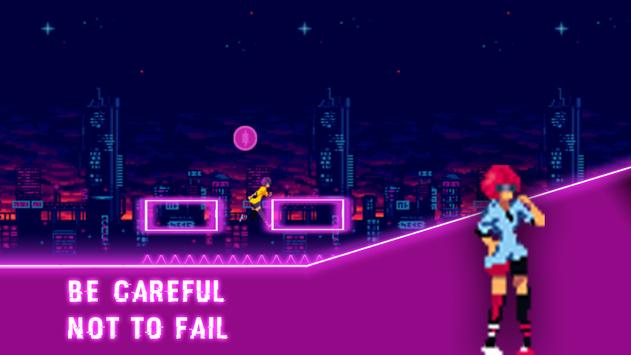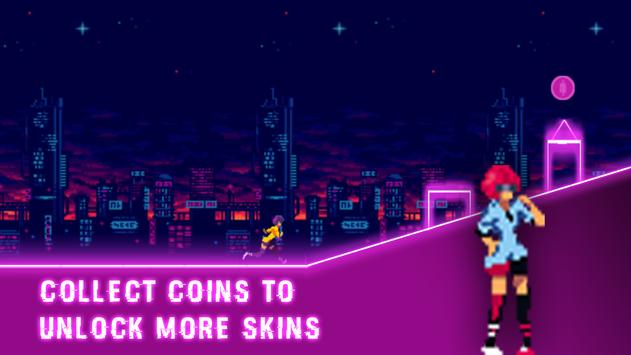 点击屏幕,控制游戏中的角色去躲避途中的障碍和陷阱,坚持时间越长,得分越高,在史诗级的音乐和酷炫的霓虹光效下,用你的手指来进行操作。游戏是一个动态无限2D的跑步者,以霓虹灯的风格呈现。这是一个放松的好方法。