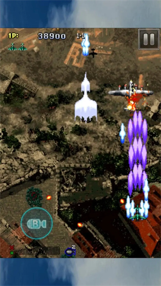 2. 成长体系:通过收集“P”道具提升武器等级,最高可强化至Lv.5,此时主武器变为贯穿弹,副武器解锁连锁闪电;宝石除解锁战机外,还可用于购买“生命值+1”“炸弹储备+1”等永久增益。
