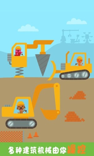 是一款儿童教育休闲类游戏,游戏中玩家可以驾驶不同的机械车,通过挖掘推土,为动物朋友们建造可爱的新家。小朋友可以自由挑选任务,进入游戏开始施工,驾驶挖掘机铲泥土,卡车运输泥土,非常有趣。