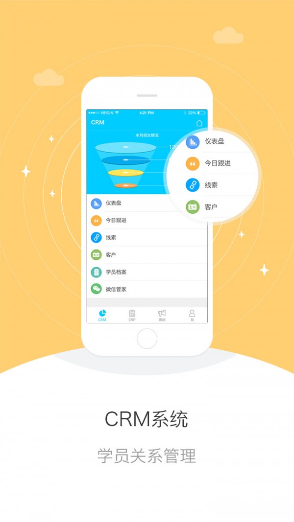 天校app专为教育机构提供行业解决方案,包括CRM—学员关系管理系统,能够随时随地录入客户信息,有效跟进客户,让商机不丢失;