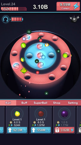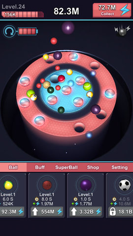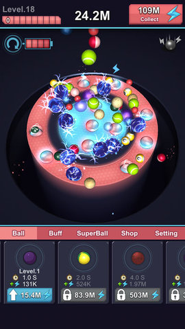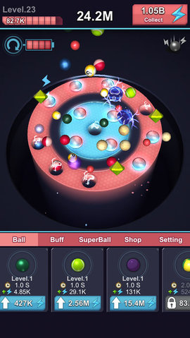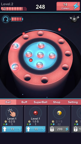 《开心跳球》玩家通过屏幕左右滑动来吃到掉落的透明小球,增加分数是自己可以获得更大的形态,如果没有吃到那么小球就会变暗,此后玩家只能通过吃相同颜色的魔力小球来消除变暗的小球,当堆积的小球超过激光切割线的时候游戏结束。