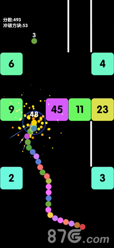 《蛇蛇打方块》是一款经典贪吃蛇与打方块并存的休闲手游。玩家在游戏中手指微操就能实现蛇蛇的运动轨迹,并将方块打破,获得球球,逐渐成为为大蛇。独创的贪吃蛇与打方块玩法,简单粗暴,让玩家耳目一新。游戏非常容易上手,一但上手后就会好玩到停不下来!天呐,怎么会有如此刺激简单的游戏。另外虽然上手简单,但是想拿高分,还是要开动脑筋的哦!一起来体验一下吧!