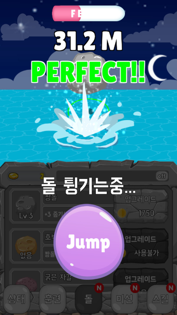 石头弹跳是一款简单的休闲类手游,游戏中你控制主角进行打水漂的活动,控制好角度和力度将石子抛出,让石子能够飞更加远的距离。比较超现实的是你可以升级你的石头,越升级就能够打越远的水漂,十分魔性,根本停不下来。