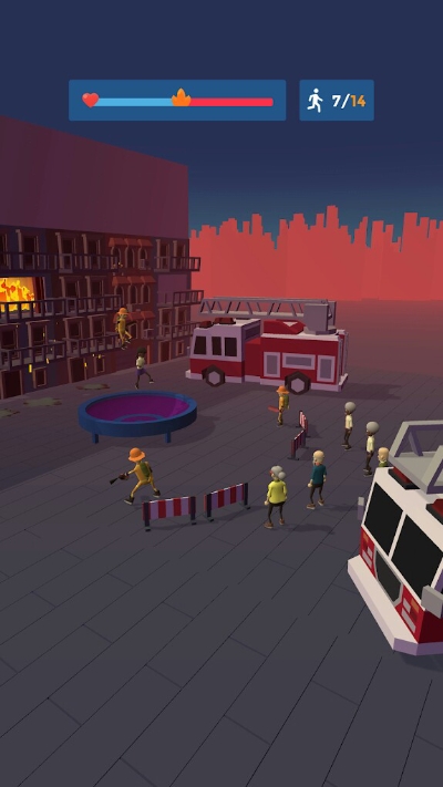 3、通过移动消防员将跳下的被困人员接住,将整栋楼中的被困的人员成功解救才能顺利通关。