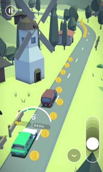 控制方式十分简单,提拉右下角的虚拟油门,汽车就会加速前进;向左向右滑动屏幕,就可让车子换道,方便拾取金币。在