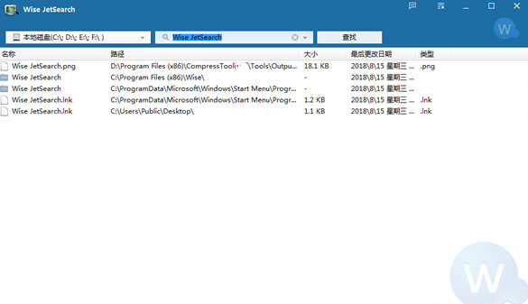 Wise JetSearch的搜索功能十分强大,完全可以替代windows搜索,它不需要创建索引,所以找到文件的速度更快,几秒钟内便可以找到保存在任何一个本地驱动器上的文件或文件夹。您只需要输入关键字,选择驱动器,然后开始搜索。