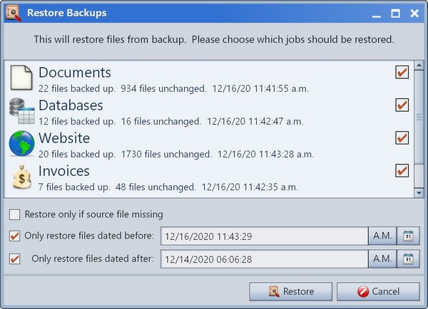 若是您发现文件丧失或破坏,请不要惶恐!Mirror Backup已为您供给保证。它许可您选择需求恢复的文件集,和您想要回滚到的日期和时间。我们的 11 步顺序将指点您完成从各种类型的数据丧失中恢复所需的步调。