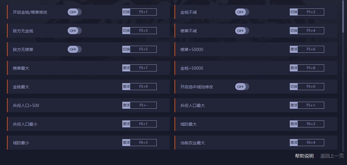 1.开启金钱/粮草修改:敌方无金钱/粮草在敌方金钱/粮草变动时生效,读档时关闭敌方无粮草/金钱修改。