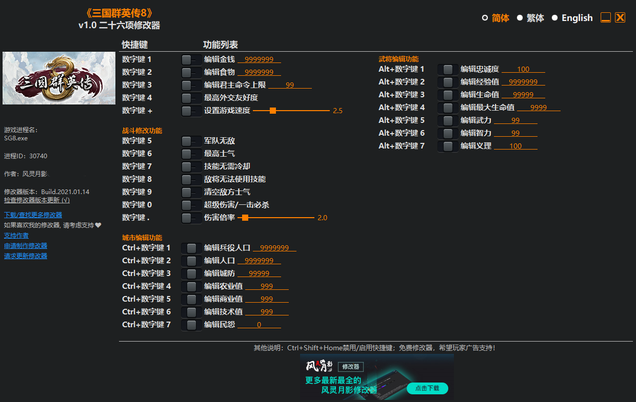 以上就是小编为你们带来的《三国群英传8》二十六项修改器风灵月影版,还想要了解更多相关应用软件的话,就来游戏爱好者看看吧!你会在这里找到更多精彩的内容,你还能够在这找到更多功能强大又简单好玩的游戏辅助软件。