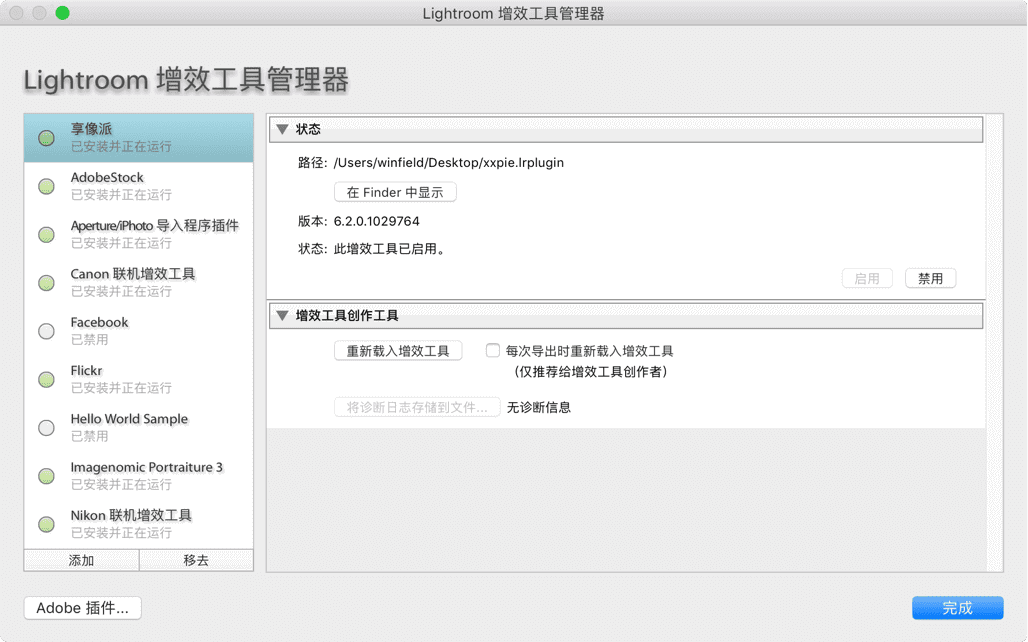在增效东西办理器场景布局点击“加入”,找到解压后的LR插件,选择“xxpie.lrplugin”文件夹,点击“完成”,加入成功后以下图所示