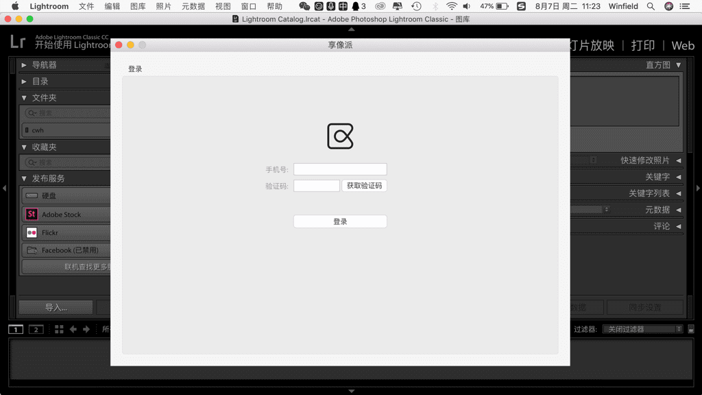修图师从Lr的"增效东西办理器"菜单中翻开“享像派Lr修图插件”,按照手机号码登录
