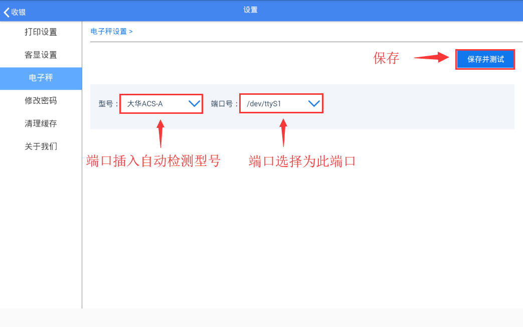 b.选择端标语/dev/ttgS1,将电子称的参数设置以下图所示,保留并测试便可