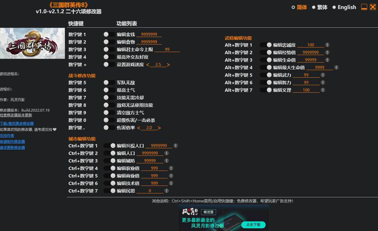 喜欢我们为您带来的《三国群英传8》二十六项修改器风灵月影版吗?关注游戏爱好者,了解更多软件和游戏资讯!