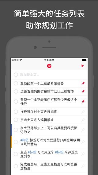 番茄土豆ios版帮助你利用好自己的时间。该软件会采用各种方式来集中你的注意力,让你能够把更多精力放在自己眼前的事情上,让你不被其他事物分散了注意力,你还可以使用该软件制定一个详细的计划。