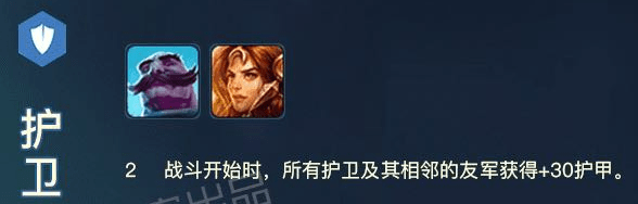 羁绊加成:2个-在战斗开始时,所有守护者和邻近格子的友军获得30点护甲加成。