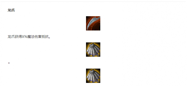 龙爪的合成公式是两个负极斗篷。它所提供的属性是增加该英雄83%的魔法伤害减免。这个属性对于法师阵容来说是致命的。因为纳尔在没有变大之前,是非常弱的,血量不及变大时候的一半。龙爪能够给予一定的保护属性。