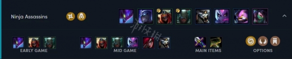 偏中期的阵容,由于忍者BUFF的特殊性,上2,3个忍者时伤害可能还没单忍者的伤害高,但是忍者中有两个刺客,所以我们要尽量攒钱升至5人口,如果运气好的话已经有4忍者3刺客了,然后就慢慢攒钱拿人,8人口时算是完全体,忍者+刺客的伤害buff让劫和阿卡丽的输出提高了一个跨度。火炮无尽绿茶优先给劫,青龙刀派克。