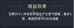狂野(4个):所有友军攻击产生怒气,最多5层,每层10%攻速