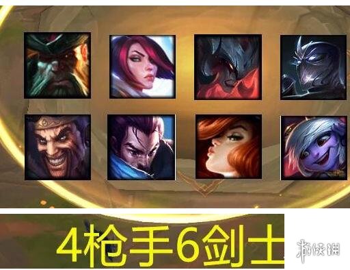 搭配4枪手的羁绊可以是4枪手6剑士,分别是小炮、女枪、卢锡安、船长、剑姬、剑魔、慎、德莱文,小炮可以给个金铲铲和反曲弓变成剑士。