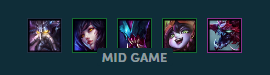 在游戏中期选到阿狸、璐璐来形成三法羁绊,拥有大虫子之后替换掉螳螂,三法、三虚空阵容初步成型。小法和莫甘娜也同样是不错的中期选择。在后续拿到龙王之后,可以将其作为大哥培养,不错的核心输出。而不易得到的死歌,则是为其后期凑成六法的工具,打出伤害和控制还是要靠龙王和大虫子。