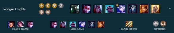 这套阵容以四游侠作为核心输出点,前期选择三贵族过度并且保留薇恩,中期直接拿到韦鲁斯、布隆、日女组成双游侠双护卫阵容(前期德玛和莫德凯撒保留凑骑士羁绊),后期则等待寒冰、千珏和凯尔的到来,阵容就彻底成型了。