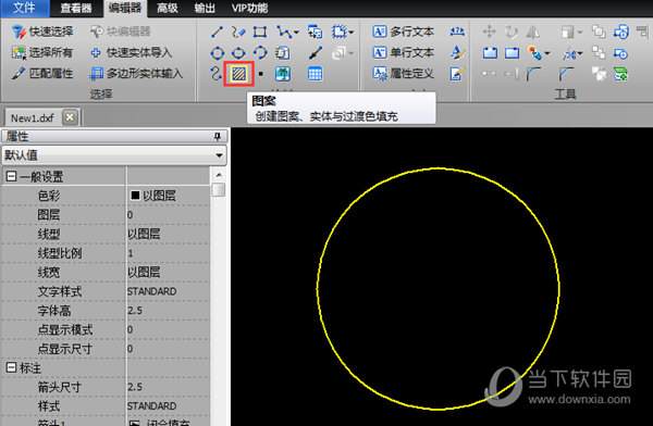 1、运行软件,自动创建一个DWG格式文件,这里在切换到【编辑器】选项卡,在绘制中选择圆图标,画一个圆对象,接下来,我们就给这个圆对象进行填充。