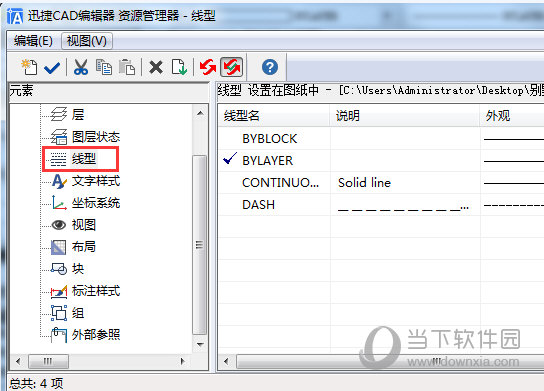 2、调出“迅捷CAD编辑器––线型”对话框,在“元素”列表中选择“线型”功能,然后在“线型名称”对选中的线型进行修改即可。
