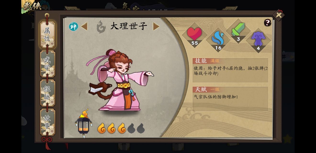 大理世子的技能又是一个神技,60%灼烧和抽二牌给了气宗就是如虎添翼。抽二牌无论是在补真气方面还是在找伤害上都有不错的表现;60%灼烧可以无脑增伤60%,并且该技能还可以与大理世子的武学产生优秀的联动。