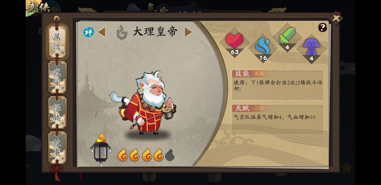 然而,大理皇帝的武学才是他强大的关键。众所周知,气宗前期比较乏力。但有了大理皇帝,一切就变得不同了。我们可以安心的把手上牌打光,然后再扔出皇帝富人武学(地图内升级后有60伤,终结时120伤),前期怪物的小身板根本扛不住他的武学。