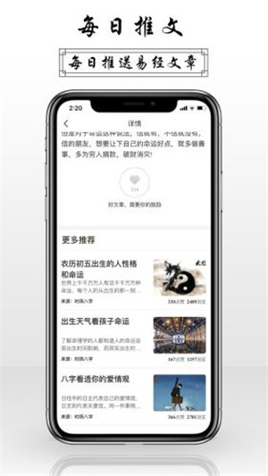 3. 每日推荐好文:每天都会为用户推荐与易经相关的好文章,帮助用户不断学习和进步。