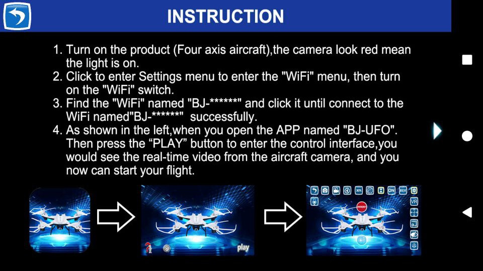 1. 远程控制:bj-ufo应用通过wifi连接,使用户能够轻松控制四轴飞行器的飞行方向和高度。