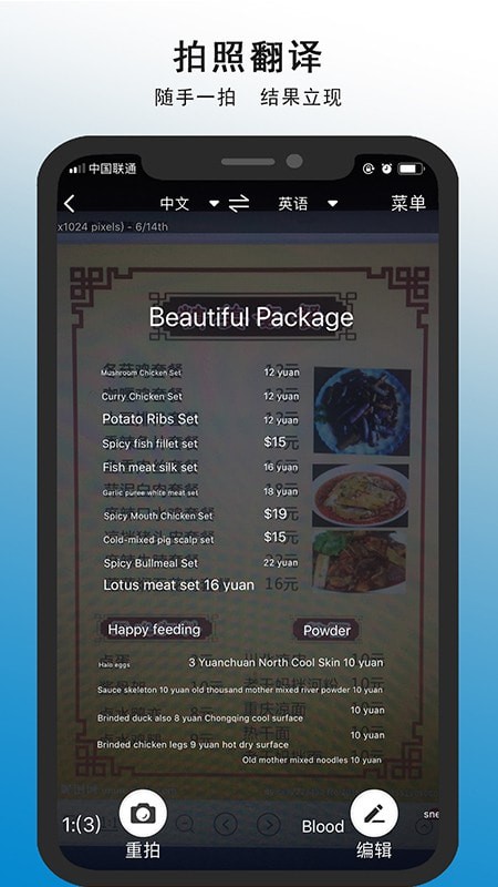 2. 拍照翻译:对准路标、文章、标签、菜谱等随时拍随时翻译,方便快捷。