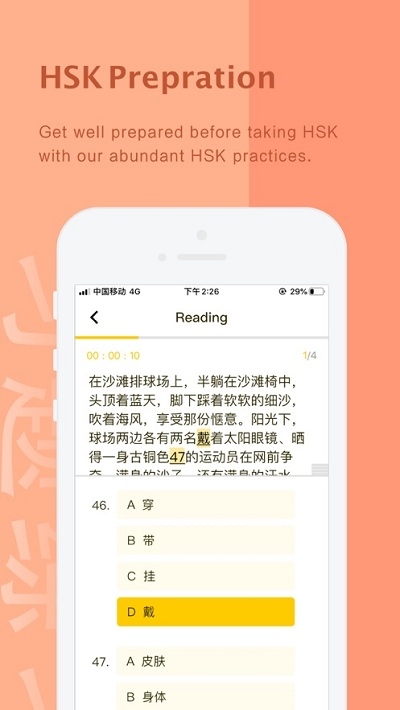 1. 海量学习资源:包含汉语考级考试中常见的6000多个词汇,以及百余套口语课程和数十套hsk模拟题。