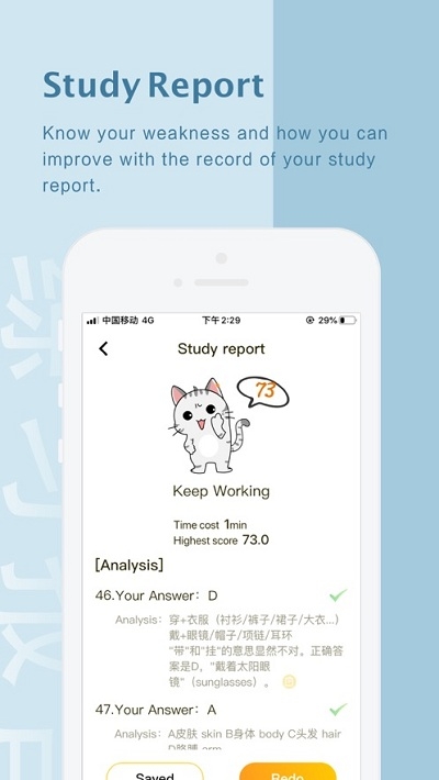 3. 错题及时解析:练习模拟试题时,如做错题目可及时查看答案解析,有助于用户纠正错误,提升学习效果。