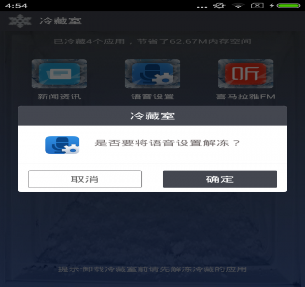 3. 智能提醒:当手机内存不足或电量过低时,软件会智能提醒用户进行清理或冷藏应用。