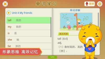 3. 单词配有形象的卡通配图及详细词典解释,便于孩子快速掌握。