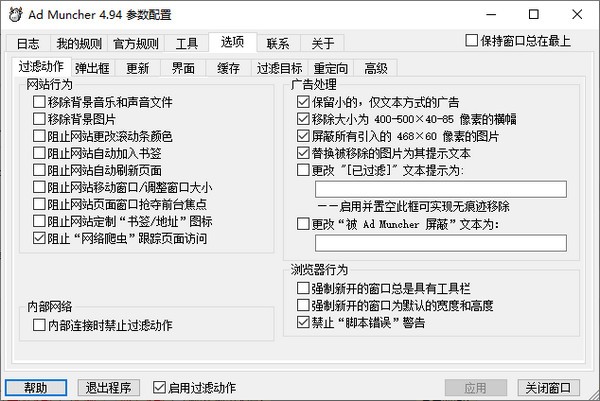 3. 设置拦截规则:根据自己的需求设置拦截规则,如选择拦截哪些类型的广告、是否屏蔽某些特定网站的广告等。