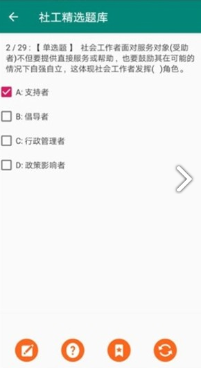 社工精选题库(社工精选题库职业资格助手)安卓正式版是一款功能强大、操作便捷的备考助手。它提供了海量的题目资源,支持多种练习模式,能够满足用户多样化的备考需求。同时,软件还具有智能批改、历史成绩查看等实用功能,帮助用户更好地了解自己的备考情况。此外,软件界面简洁明了,操作便捷,使得备考过程更加高效。总的来说,这款软件是备考社会工作者职业资格的绝佳选择。