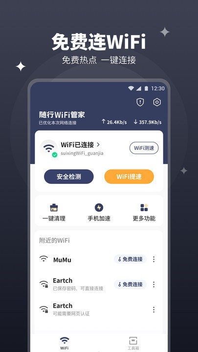 随行wifi管家单机版是一款专为安卓用户设计的网络连接管理工具,它提供了全面的wifi连接、管理、优化和安全保护功能。无需依赖外部网络,即可在本地实现wifi热点探测、连接管理、网络加速和网络安全测评等功能。这款软件界面简洁明了,操作简单便捷,是用户出行、办公、娱乐时不可或缺的网络助手。