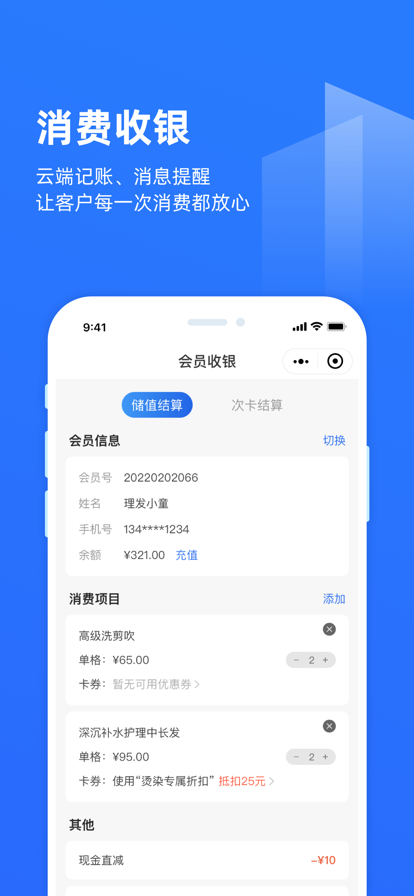 4. 进行收银操作:在收银模块,商家可以选择结算方式(如储值、次卡等),输入消费金额,并选择参与服务的员工,系统会自动计算员工提成并生成消费记录。