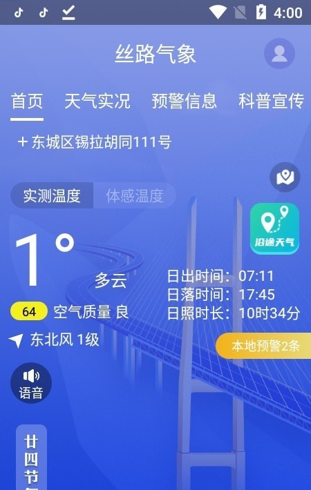 丝路气象是一款由新疆气象局牵头、各地(州)市气象局配合研发的综合性气象服务安卓软件。它不仅提供了全面的天气预报和气象灾害预警信息,还针对不同用户群体(如公众用户、决策用户和专业用户)提供了定制化的气象服务。这款软件致力于实现交通、能源、旅游等重点行业气象高敏感行业数据信息的全面深度融入,为用户量身打造一体化、定制化、伴随式气象服务。